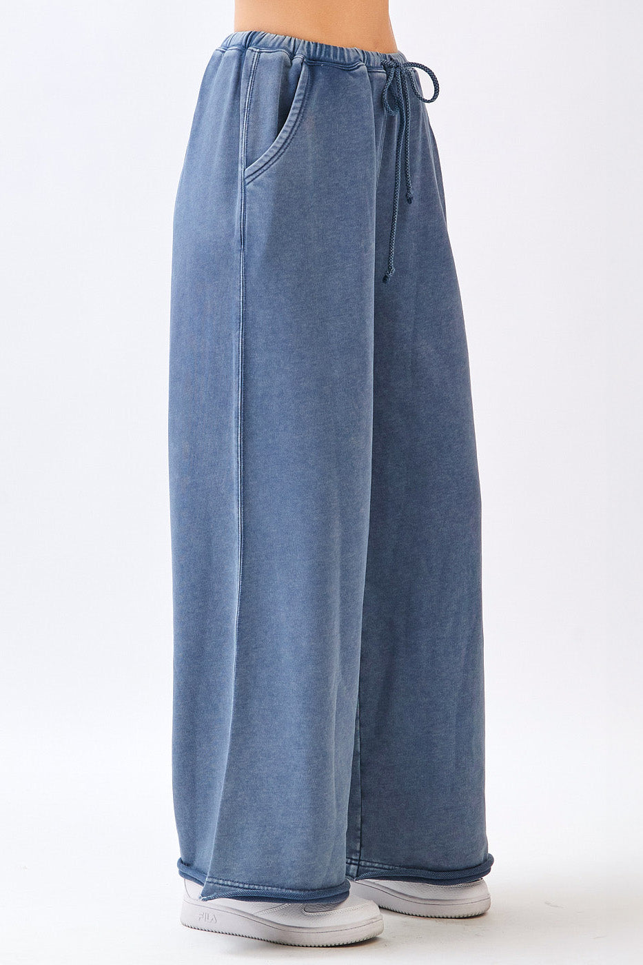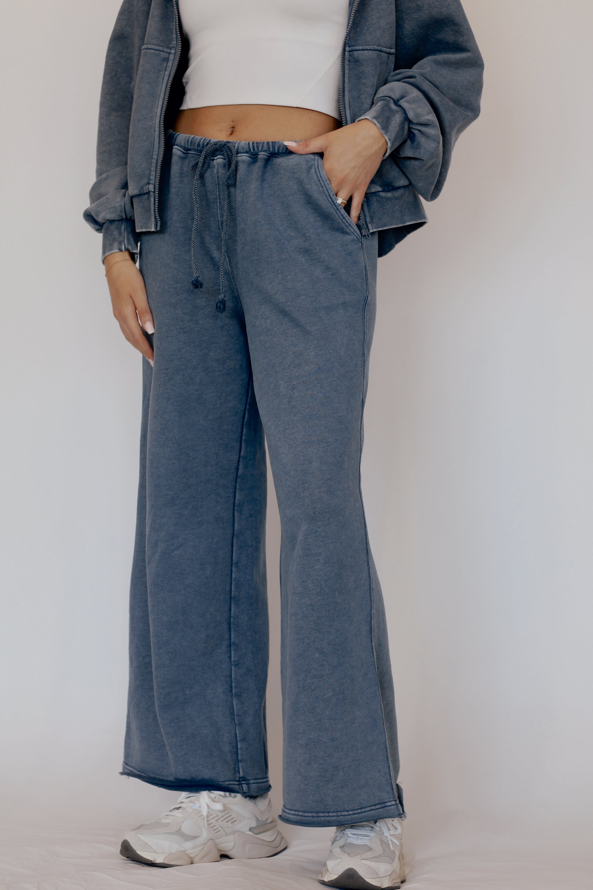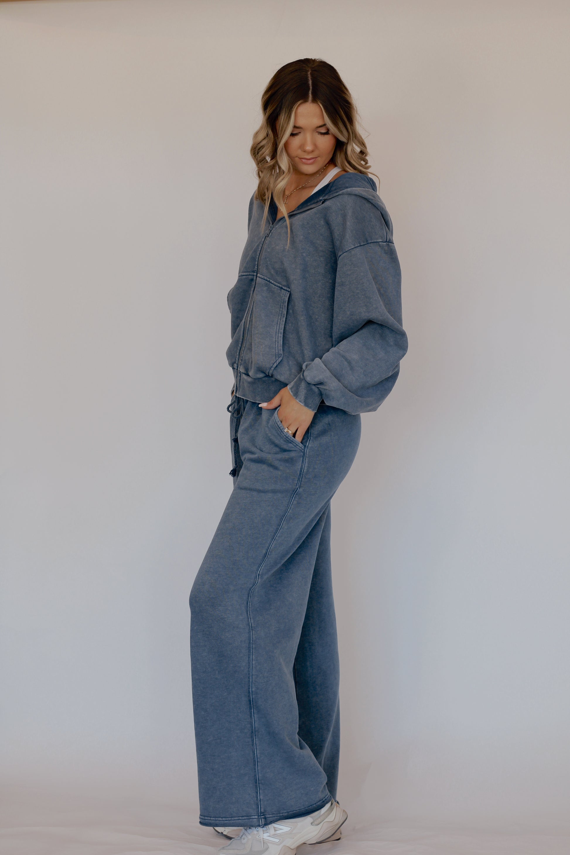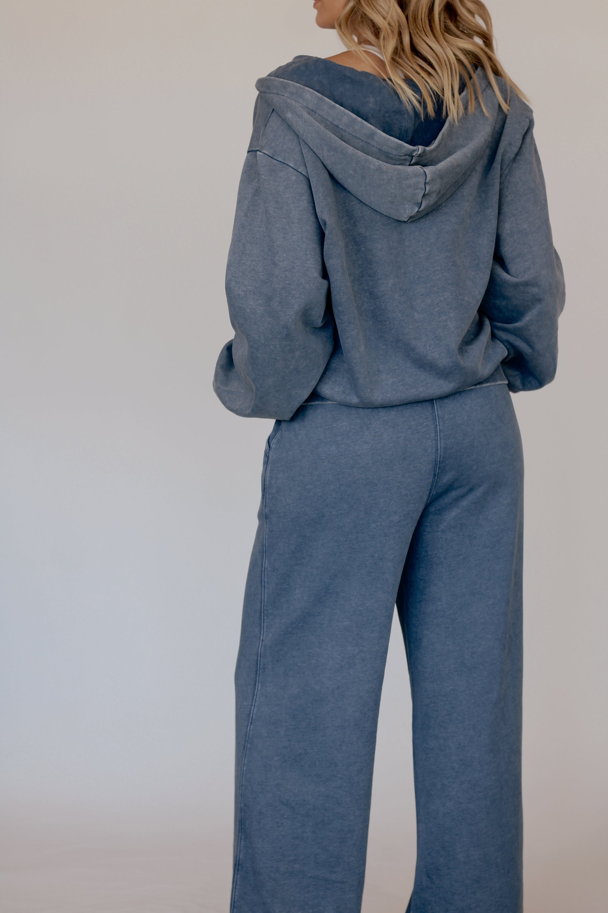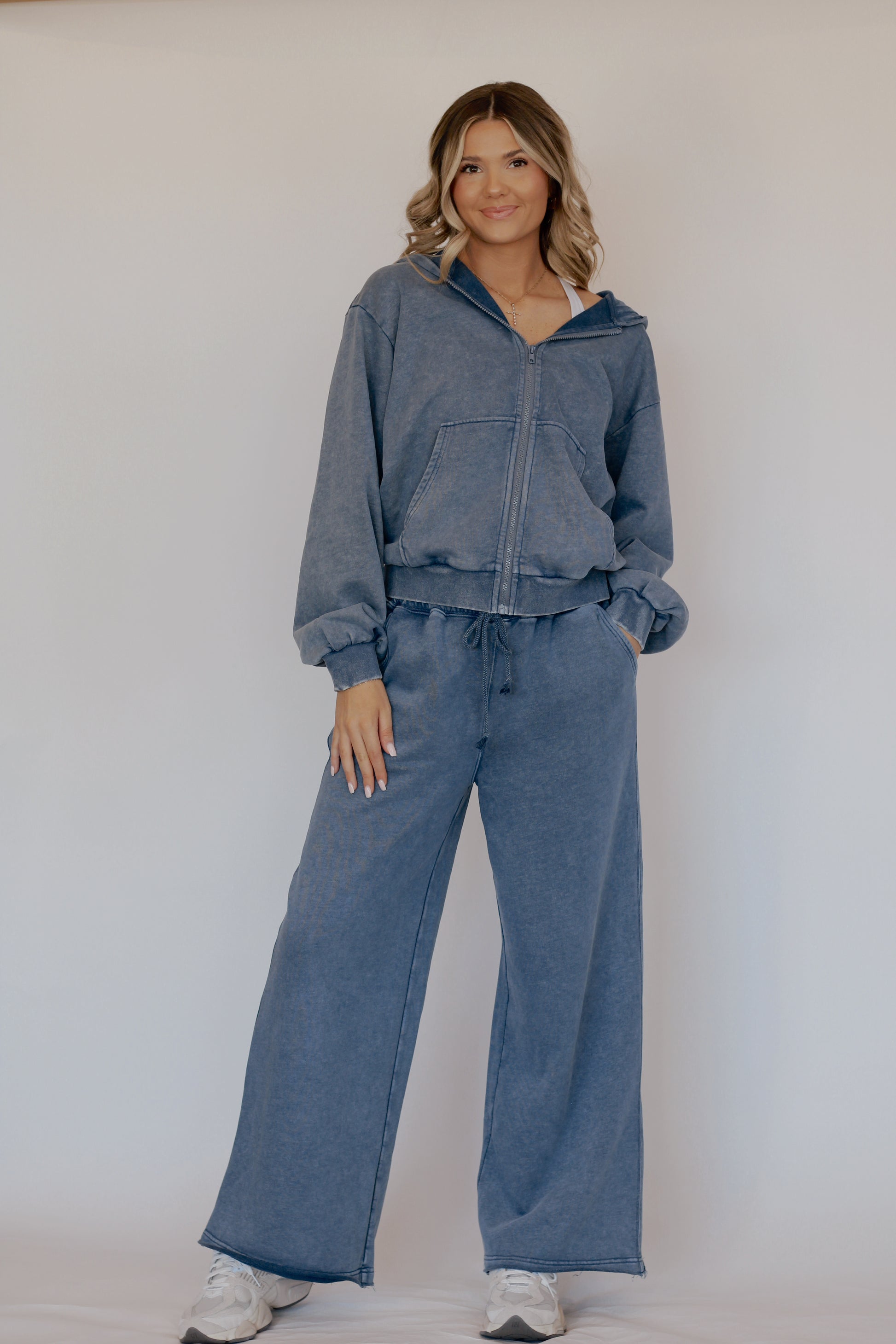 Our "Voyage Mineral Set" features a zip-up cotton french terry jacket with a relaxed fit and matching wide leg pants.