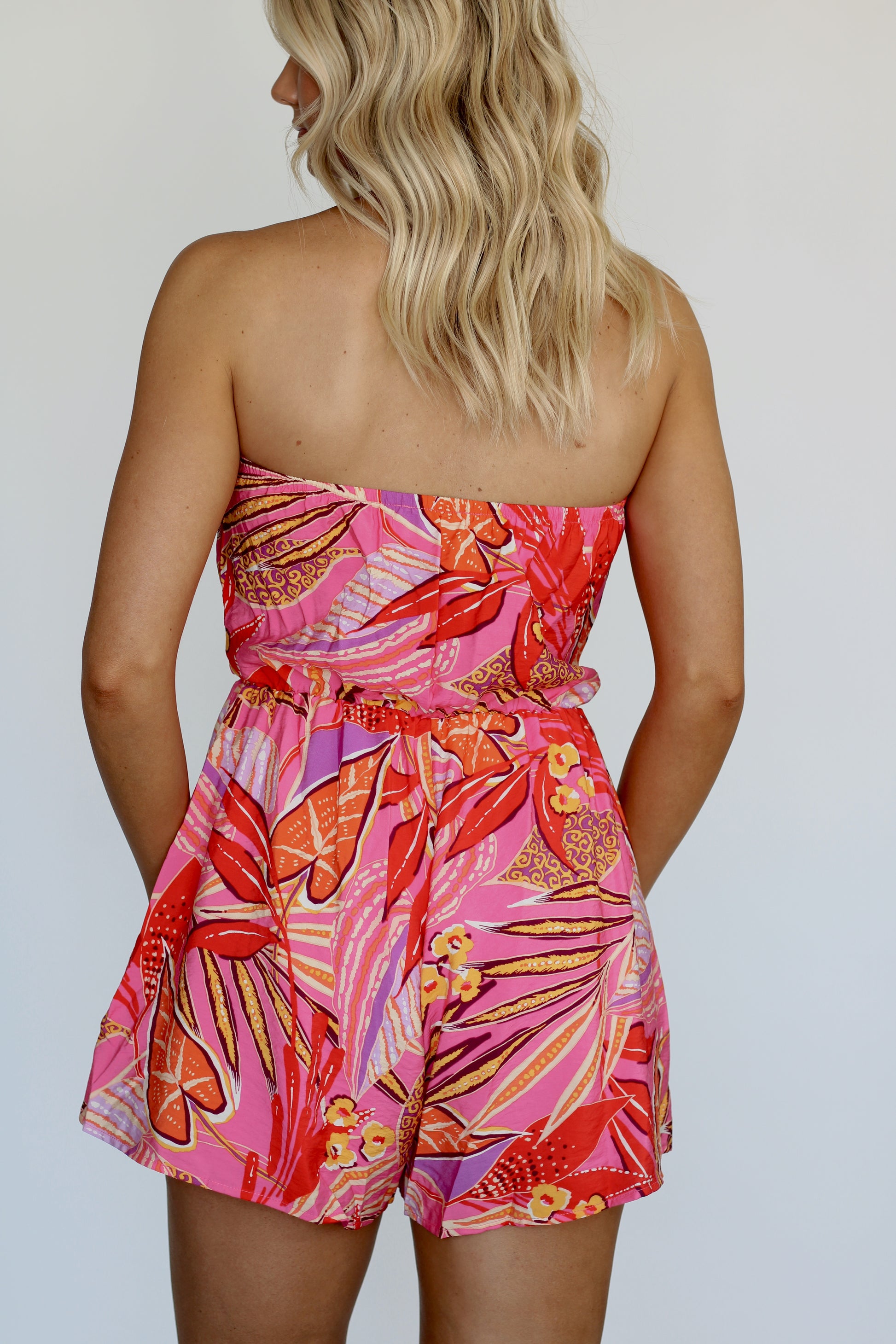 Our "Tropics" Romper features a v trim tube top, tropical print, with lined shorts.