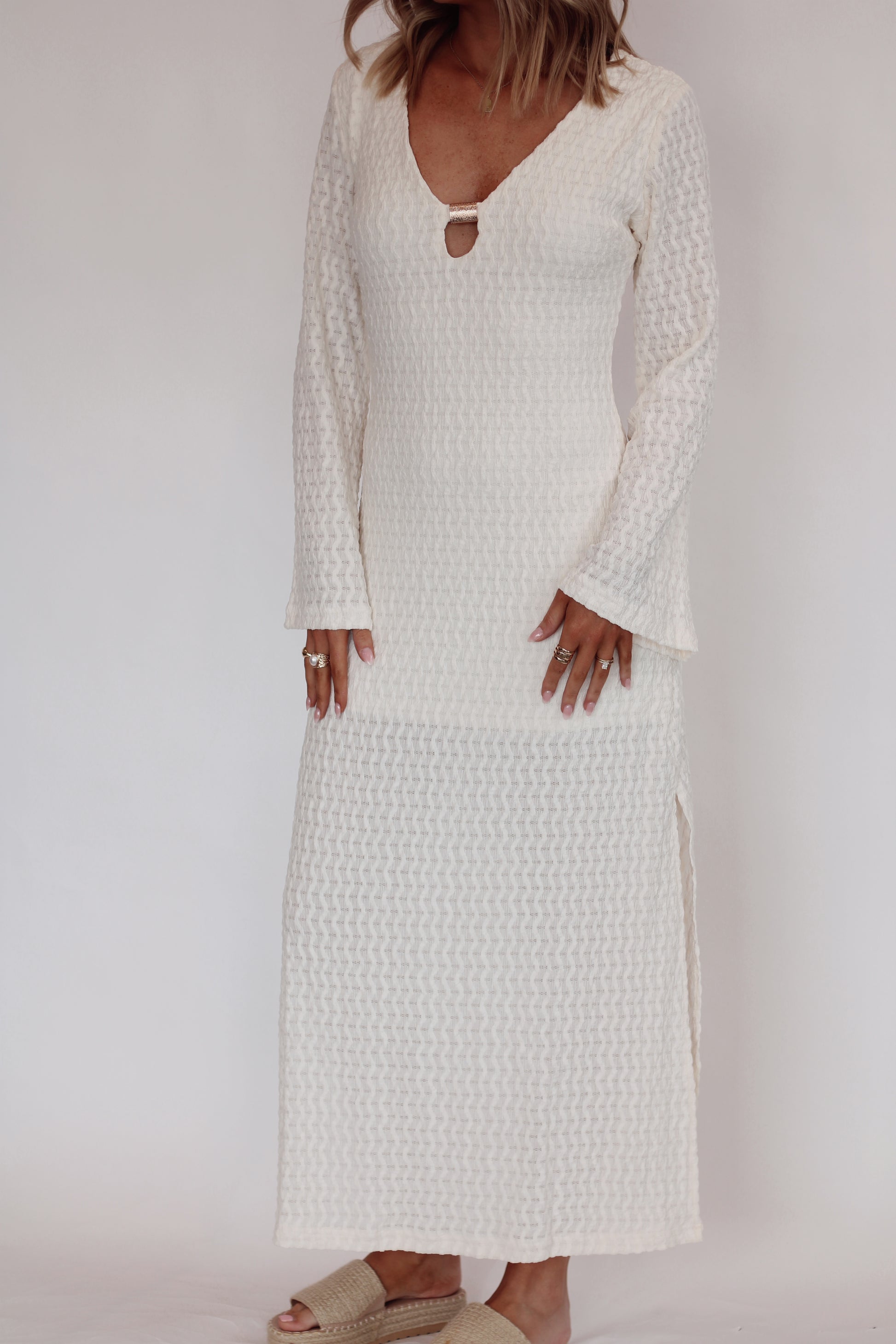 Our Marble Shore Maxi Dress features a stretchy textured fabric, side slits, lining, and pull on closure.