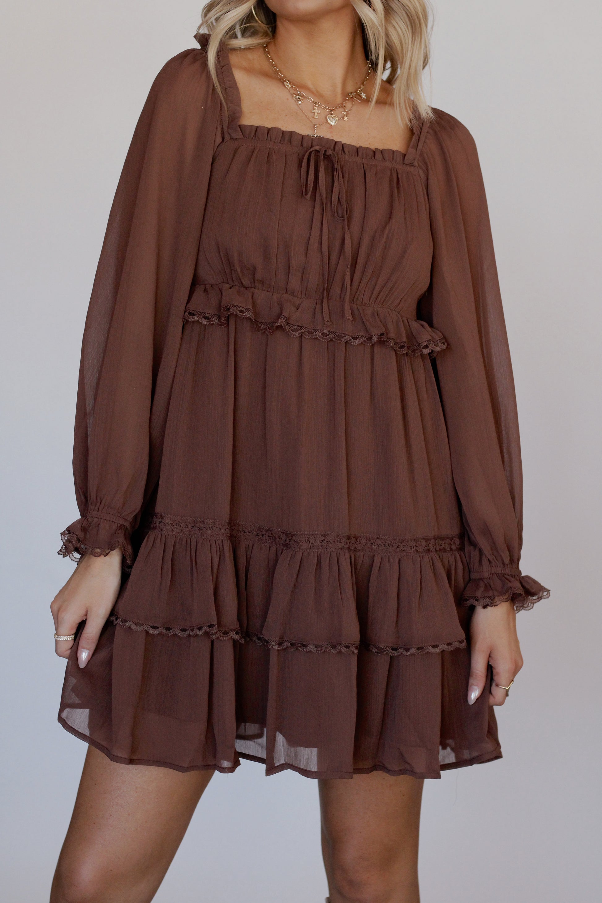 Our "Mocha Muse" dress features a smocked back, a tiered skirt with lace trim, side seam pockets, and a fully lined body.