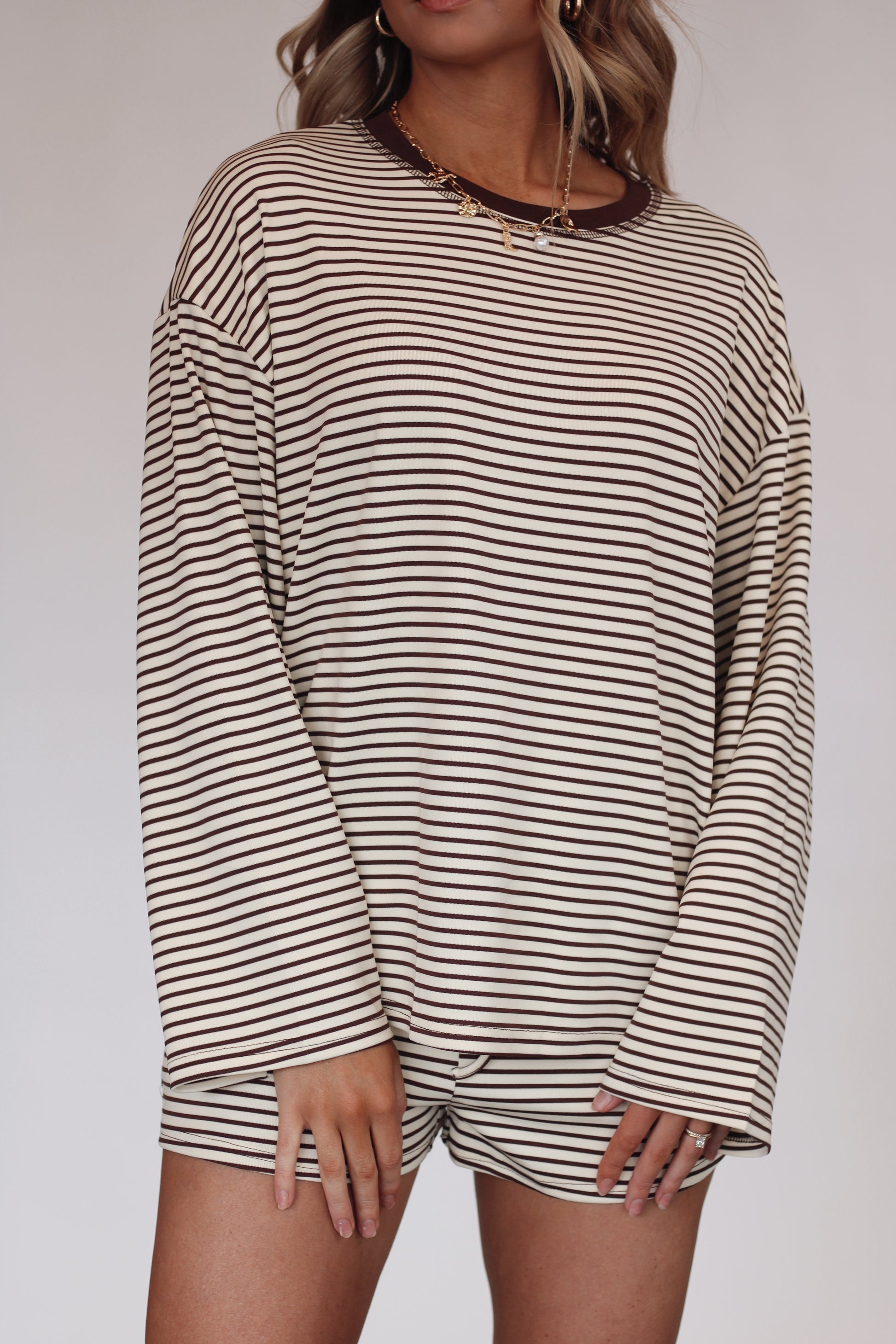 Our "Soft Landing" Set features striped shorts with an elastic waistband, drawstring, side pockets and a matching slightly oversized top with a bold contrast neckband.